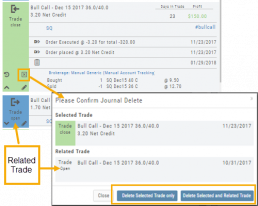 Clicking on the [x] icon on the Journal Tab allows you to delete the Selected Trade or the Selected and Related Trades.