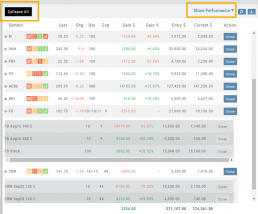 The Position Tab default view displays Share Performance and Expand All for trade detail on multi-leg positions for a high-level quick view.