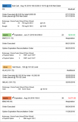 The trade detail report displays the status, Open, Close, Expire with a color code of the trade: Blue=Open, Green=Profit, Red=Loss, Yellow=Unmatched.