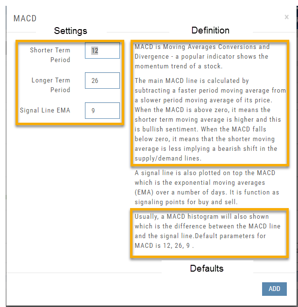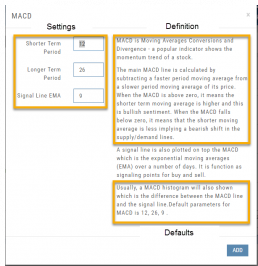 In addition to the settings, this feature also provides a description of the indicator and the default settings.