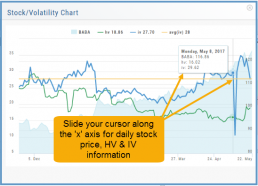 Expanding the Stock/Volatility Chart allows you to view past Historic Volatility, Intrinsic Volatility and stock price on a day-to-day basis.
