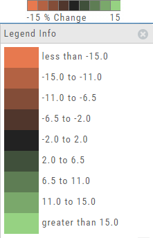 The Legend shows the range of % negative or positive change represented by a color spectrum. It is important to note: the range does adjust according to the data filters you select for the Heat or Spectrum Maps.