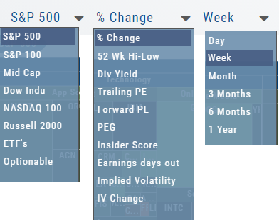 Drop-down menus allow you to select Index, Time Frame and various Data Points. Choose among % Change, Dividend Yield, PEG, 52 week High-Low and more.