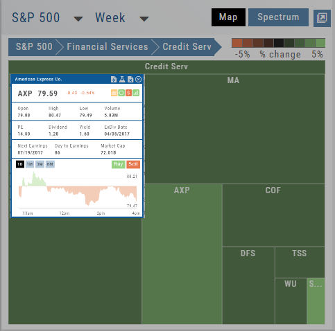 The Heat Maps are accessible in the Market tab and under Find>Explore and provide powerful visual views of market performance. This feature is designed to adapt to a variety of strategies and outlooks according to your portfolio needs. Select Index and Time Frame using the Action Icons. These can be changed going forward in any map screen.