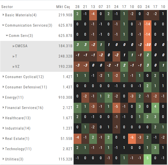 In the Communication Services example, the average for the Sector is 55. When expanded, we see Netflix (NFLX) is near the top of it’s 52-week range at 96. Centurylink (CTL) is closer to the low end of it’s range at 14. Verizon’s current price is in the middle of the High-Low range.