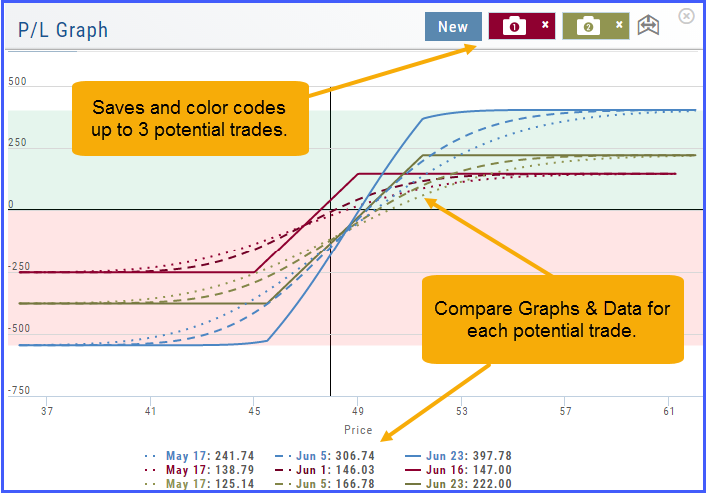 You can compare up to three (3) positions on one graph by utilizing the Camera Icons. Once you complete one trade scenario, click the first camera then click ‘New’. Structure your second trade scenario, click on the second camera. To add a third scenario, click new to structure an additional trade. The graphs will overlay.