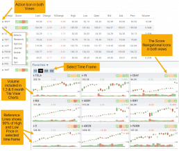Tile View shows thumbnail charts of the entire list. These can be viewed in a variety of periodicies. Volume is included in the 1, 3 & 6 month views to assist with quick analysis. Horizontal Reference Lines show where the Low Price and 90% of the High Price points the stock had for the selected time period.