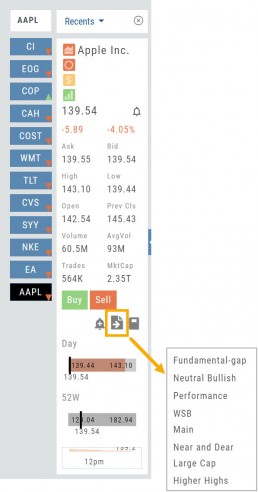 In addition, when a symbol or group of symbols is sent to Research from anywhere else on the platform, it will appear on a list under the default “Recents” list.
