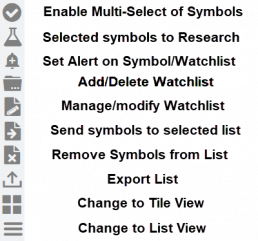 next to the Stock symbol in either the List or Tile View will bring up a menu offering additional choices for that Stock.