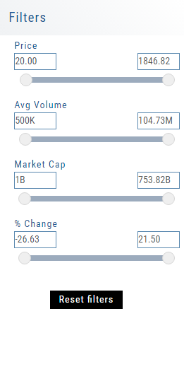 Streamline your results by using the Filters for Price, Average Volume, Market Cap, and more. The data will be displayed dynamically based on filter changes. You can set your filters and the Platform will remember it until you change or reset it during the current session.