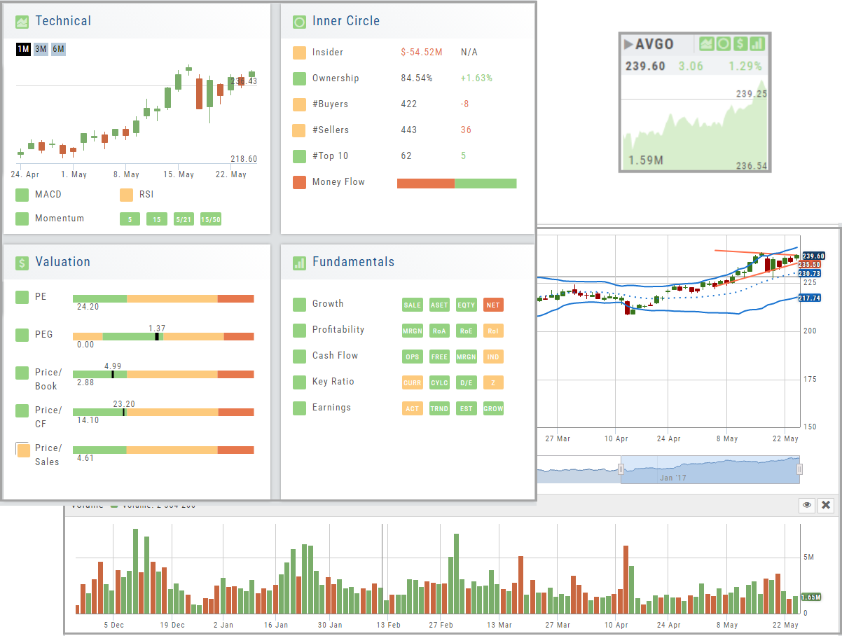 The stock dashboard provides a more detail summary layer view of The Score. Each component: Technical, Inner Circle, Valuation and Fundamentals allows you the ability to obtain the information you want, when you want it – and kept tucked away, when you don’t.