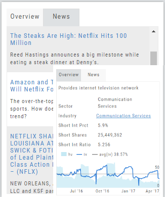 The Scan Tab is particularly interesting. In addition to providing a list of scans the stock is currently included in, it can give you a “story” about the stock. Based on the scans that the stock is showing up in, you can get an overview of outlook on the stock.