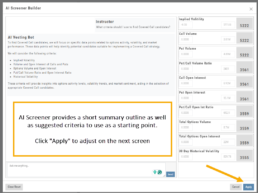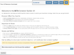 Located on the Screener page (under the Find Tab), click the AI button to enter your inquiry in the “Ask Me Anything” box at the bottom of the table, then click “Send“