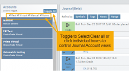 Reviewing your Journal Accounts is made easier by using the Multi-Select tool on the Journal Tab. Control your Journal Account Views by selecting from Live, Virtual, Manual accounts or Notes or any combination of these.