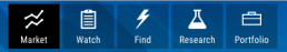 Start with Market to see an overview of the current market. Watch will keep you on track with your stocks. Find will assist in identifying opportunities. Research gives you all the detail you need.