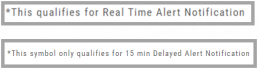 Alerts are RealTime if you have Streaming Quotes on the platform – OR – have a linked brokerage account that provides RealTime quotes to the platformAND – have logged into that account in the last 30 days.