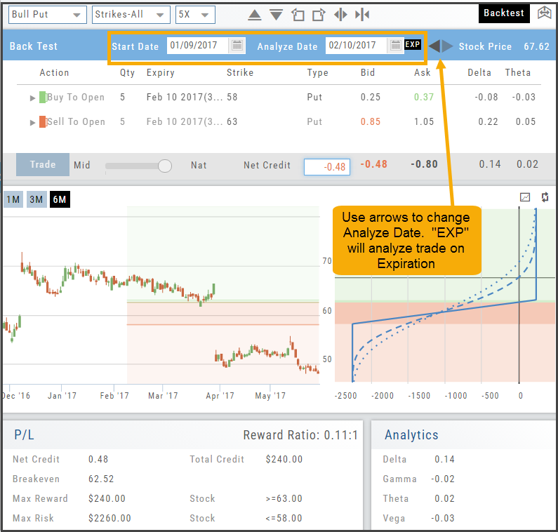 - Select the Analyze Date, or click ‘EXP’ to analyze the position on Expiration Day.