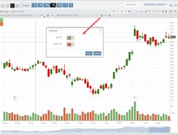 In addition, the Volume bar colors can be customized as they are an independent indicator from the candlesticks. This is done by clicking on the gear icon, as shown.