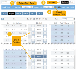 Note: The prices in the options chain will show the start date prices. The prices in the Analysis Panel will reflect the Analyze Date prices.