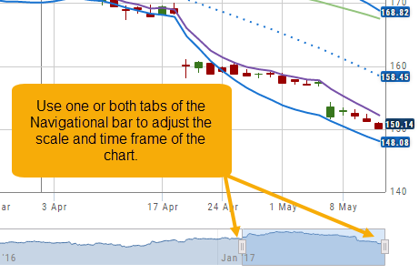 The next set of icons immediately below this gives more charting capabilities: Increase/Decrease price ranges, Reset price range, Hide/Show Navigation Bar, Move the date Back/Forward, Export/Print Chart