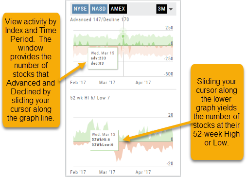 Likewise, the bottom portion of shows the number of stocks that reached their 52-week High or Low by sliding your cursor along the lower graph.