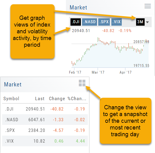 In the default Graph View, get an visual view of Market or Volatility Index activity by a 1-day or 1, 3 or 6 month time frame. By sliding your cursor along the graph, an activity box will display more in-depth activity: Every two minutes for the 1-Day Graph, or Daily for the 1, 3 or 6 month graph.