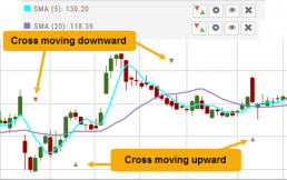 Example: If you select the 5 day and 20 day SMA the Green arrows will show the 5/20 crossover points when in an upward movement, Red for downward.