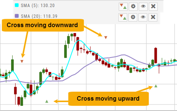 Example: If you select the 5 day and 20 day SMA the Green arrows will show the 5/20 crossover points when in an upward movement, Red for downward.