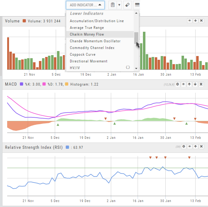 We offer select Advanced Upper and Lower Indicators that are not just derived from the price, including proprietary indicators like “Invest4Score” and “Insider Score”. They are accessible by using the “Add Indicator” drop-down box.