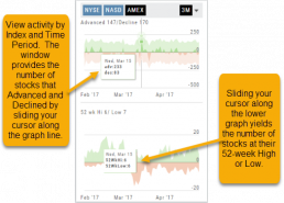 Likewise, the bottom portion of shows the number of stocks that reached their 52-week High or Low by sliding your cursor along the lower graph.