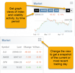 In the default Graph View, get an visual view of Market or Volatility Index activity by a 1-day or 1, 3 or 6 month time frame. By sliding your cursor along the graph, an activity box will display more in-depth activity: Every two minutes for the 1-Day Graph, or Daily for the 1, 3 or 6 month graph.