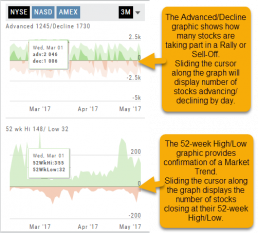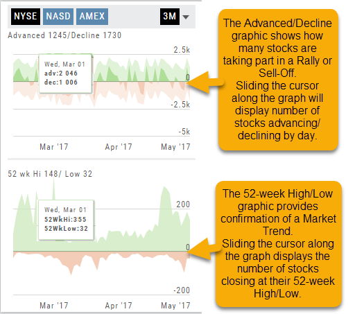 Likewise, the bottom portion of shows the number of stocks that reached their 52-week High or Low by sliding your cursor along the lower graph.