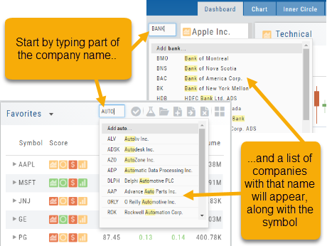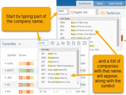 For example, typing “Bank” in the Symbol box will bring up the stock symbols and names of companies with “bank” in their name.
