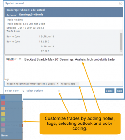 This Journal has benefits and features that allow you to truly customize a vital part of the trading process. Each trade allows you to: Make Notes, add Tags for organizational purposes as well as Color Tags you customize, Outlook icons further customize each trade entry.
