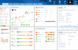 The Dashboard provides an overview: Quote Detail, The Score, Activity such as News/Earnings/Dividends and information about the Company and a list of other company stock symbols in the same industry. Each component has it’s own tab to provide more detail.