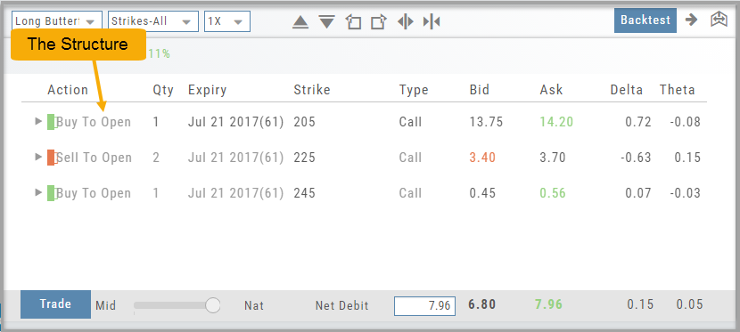 A Strategy Template provides a shortcut to quickly create an option strategy, virtually eliminating structure errors. Once selected, you can modify the structure within the template using the tools on above the option tables: Moving Strikes up/down, rolling Time out/in, widening or narrowing Strikes.