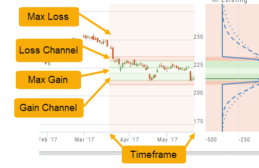 The width of the channel on the chart represents the timeframe of the trade. If options expire in 30 days, the channel will display back 30 days on the chart. This give a visual reference for the time frame of the trade.