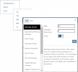 Indicators: Over a dozen indicators available to add to each chart. You can edit and remove/change selected indicators on each chart.