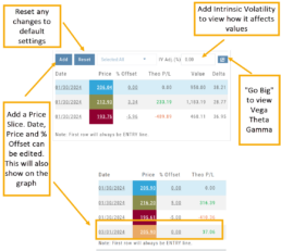 Price Slices allow users to view theoretical outcomes of option positions, while providing the flexibility of changing data points, such as entry price or what the results will be if the stock price moves a specific dollar or percentage amount.